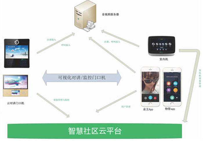 采用“云對講門口機+云平臺+音視頻平臺+室內機+業主app+物管app”的系統架構