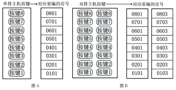 注:直按式主機編碼時,先要確認主機屬于哪種類型,再確認各按鍵所對應要編的房號,然后參考第六章的“6.3房號設置方法”進行房號的設置。